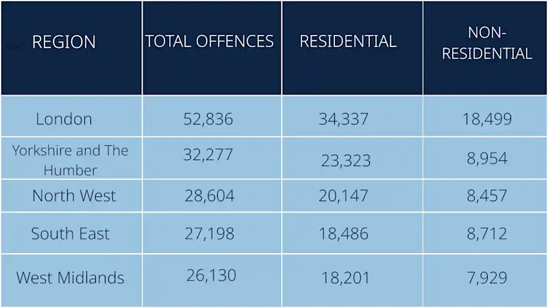 London, Yorkshire and The Humber, and the North West remain the regions most affected by burglary, with residential properties making up the majority of offences.