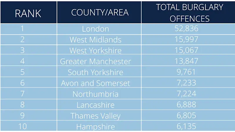 West Midlands, West Yorkshire, and Greater Manchester are among the most affected counties, highlighting urban areas as burglary hotspots.