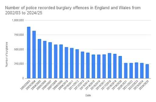 Burglary offences have fallen by 72.5% since 2002/03, from 890,099 cases to 245,284 in 2024/25.